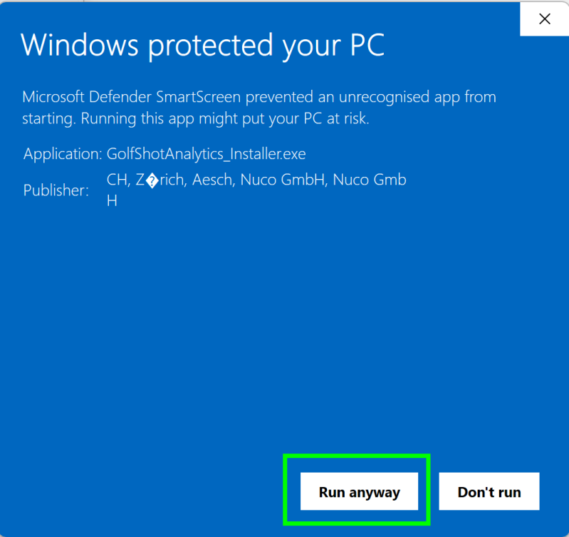 When you install Golf Shot Analytics on Windows, you may see a warning such as “Windows protected your PC” or a message about an unknown publisher.