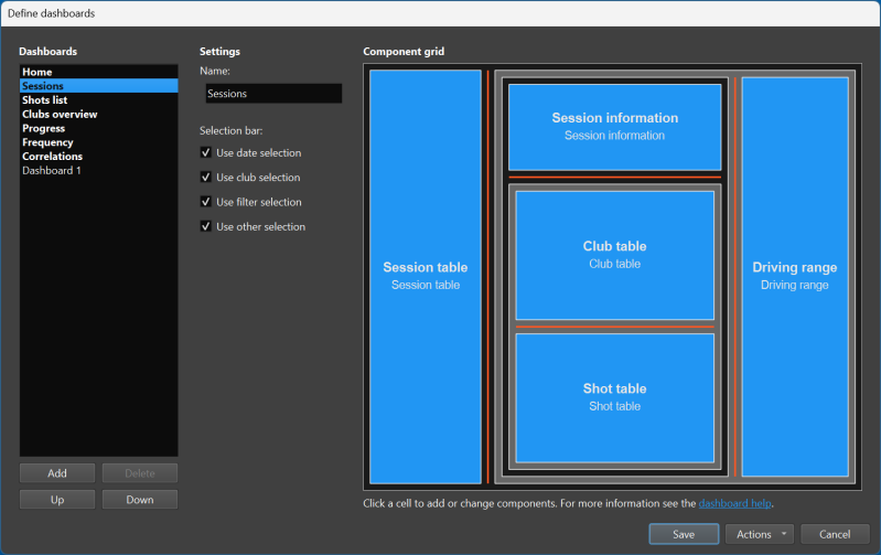 Every page you look at in Golf Shot Analytics is a dashboard. There are a number of standard dashboards that you can change. And you can easily create your own dashboards. You can, for example, create dashboards about particular clubs or about particular types of metrics. To this end, click the edit icon (the pencil) in the toolbar at the top of the window, or select Define dashboards from the settings menu in the toolbar. The following dialog will be shown: